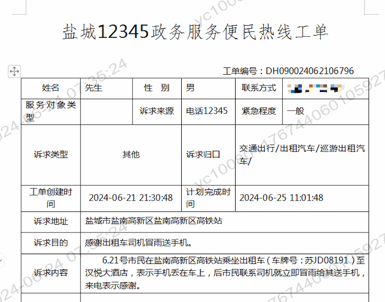 6月25日,开元网站登录入口出租汽车公司收到市交通运输服务中心转来的12345政务热线表扬工单,感谢的哥顾爱斌师傅及时归还丢失的手机。