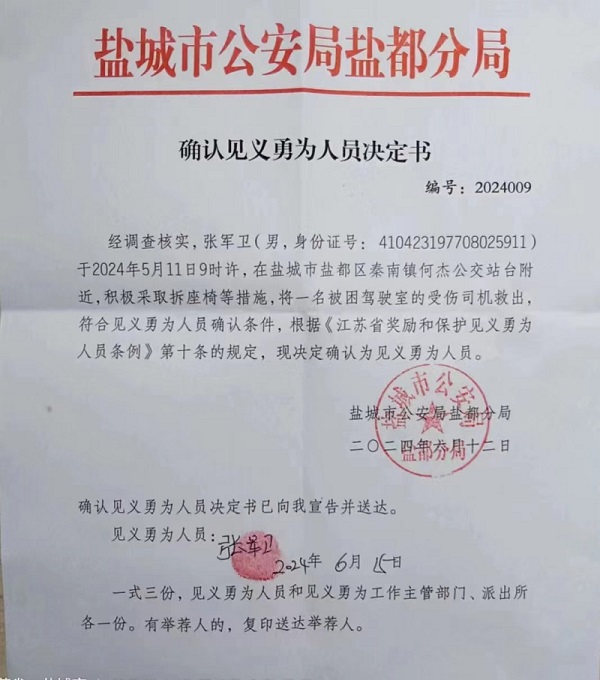 近日,盐城市公安局盐都分局为K601线驾驶员张军卫颁发了“确认见义勇为人员决定书”,并送上见义勇为奖励基金。至此,公司见义勇为人员已增至19人。