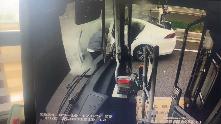 眼看轿车火势越来越猛烈,王久鹏立即将车安全停靠,跟车内乘客打了声招呼后,他先是将驾驶室旁的灭火器递给车主,随后又抄起车上另一个灭火器快步冲向起火车辆,与车主共同灭火。