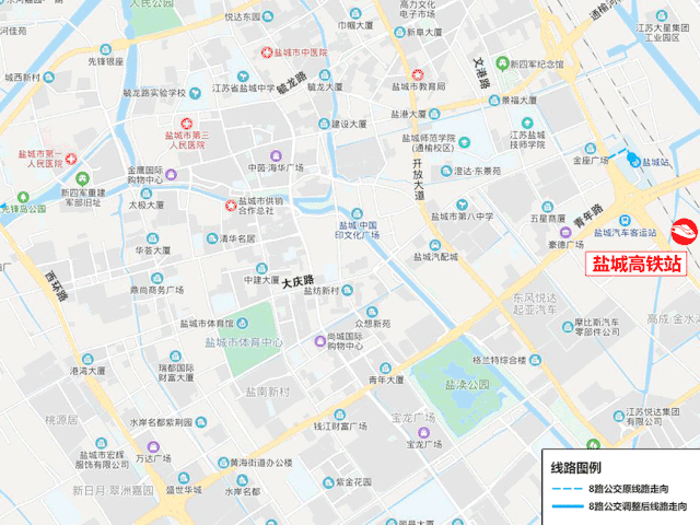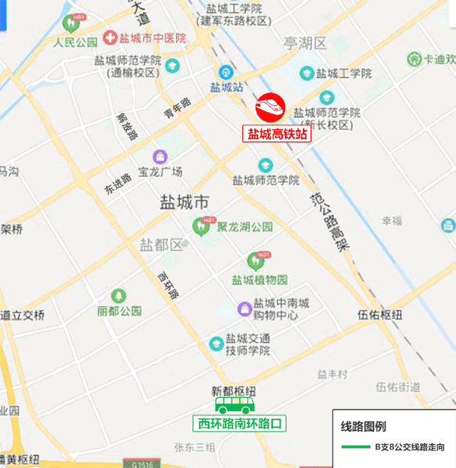 线路走向:盐城高铁站、青年路、范公路、大庆路、文港路、毓龙路、西环路、大庆路、文港路、青年路、盐城高铁站