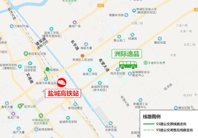 线路走向:洲际逸品、松江路、希望大道、亭湖大道、长亭路、建军东路、文港路、青年路、范公路、盐城高铁站