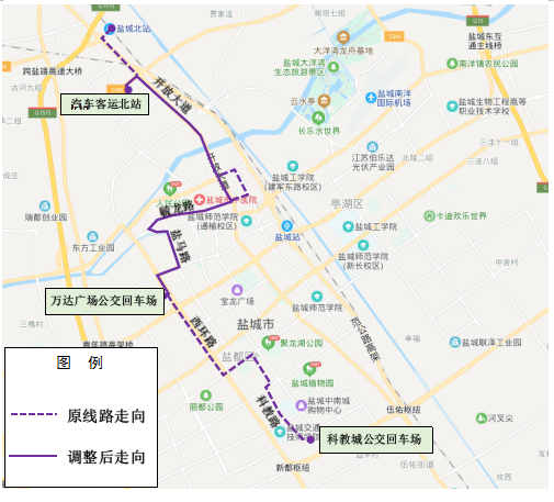 原走向:从盐城火车北站发车,途经开放大道、黄海路、文港路、毓龙路、建军西路、盐马路、大庆西路、西环路、新都路、盐城路、园中路,发往科教城开元网站登录入口回车场。调整后走向:从汽车客运北站发车、开放大道、黄海路、文港路、毓龙路、建军西路、盐马路、大庆西路、西环路,发往万达广场开元网站登录入口回车。