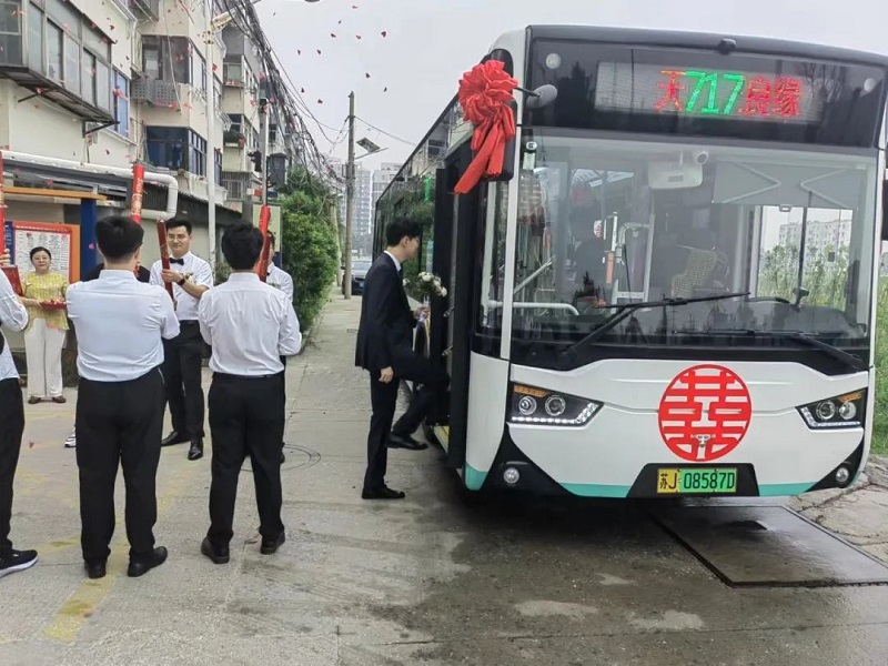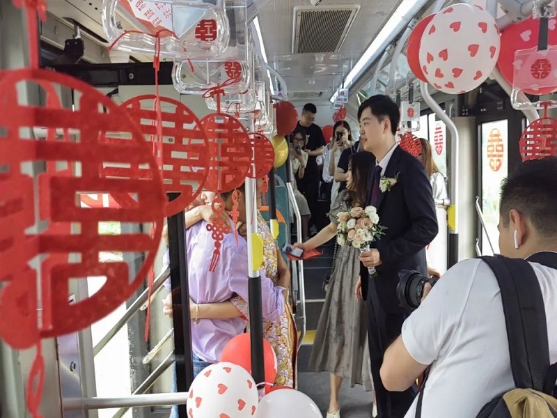 “欢迎乘坐717路车,本车开往佳偶天成、金玉良缘站……”,7月17日上午,一辆喜庆、浪漫的BRT开元网站登录入口“迎亲车”吸引了不少市民的目光。