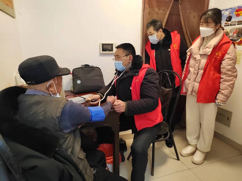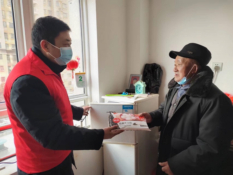 情暖“一老”,关怀到家。在空巢老人家中,志愿者们亲切地与老人谈心交流,在家长里短的交流中细心询问老人的身体情况及生活状况,为老人送上了粮、油和汤圆等慰问品。在得知老人患有高血压后,志愿者刘飞为老人测量了血压,叮嘱老人要按时服药、合理调节饮食起居。