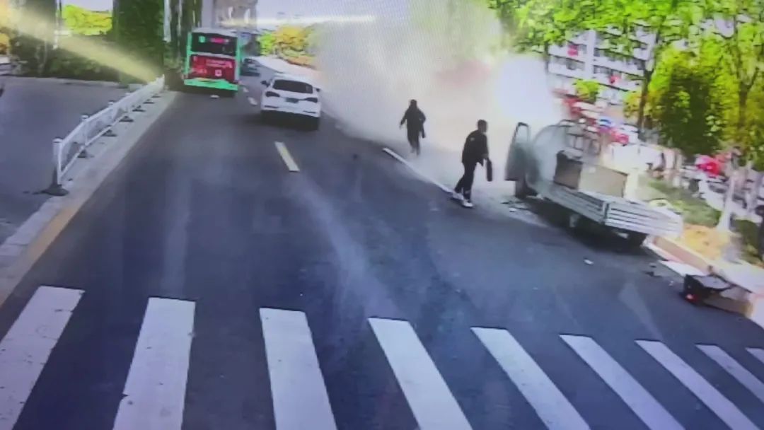 监控显示,5月9日上午11时36分左右,31路线驾驶员金浦驾驶苏J09797D行驶到西环路鹤翔路口附近时,发现一辆行驶中的小货车车后厢的货物燃起熊熊大火。发现着火后,车主立即停车设法扑救。